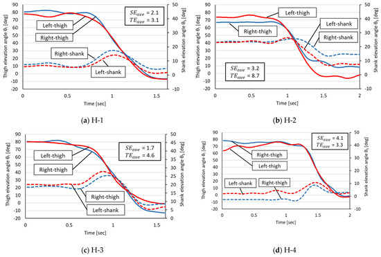 Measured angular changes in thigh and shank EAs in the healthy group. The horizontal axis is the STS time (in seconds) of each participant. H-1 through H-4 in the figure refer to each healthy participant in Table 1.