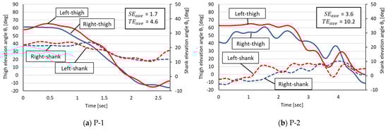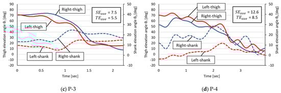 Measured angular changes in thigh and shank EAs in the rehabilitation patient group. The horizontal axis is the STS time (in seconds) of each participant. P-1 through P-4 in the figure refer to each rehabilitated patient in Table 1.