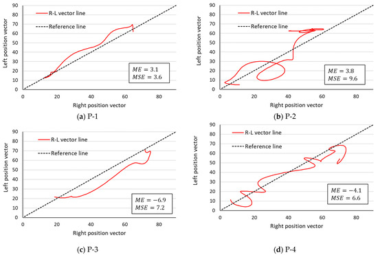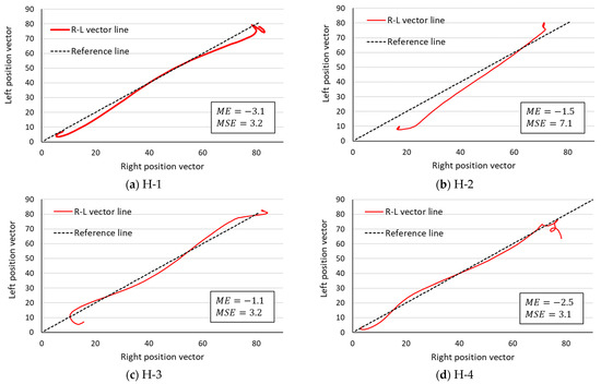 Figure 6 and Figure 7 present the R–L vector lines for the healthy participants and the rehabilitation patients, respectively. Here, the numbers 1–4 assigned to each participant refer to the same participant’s results for the measured EAs (Figure 4 and Figure 5). Table 3 shows the and the obtained from the R–L vector line and the symmetric reference line; the is the error in the position vector norm of the R–L lower limbs, which approaches 0 if the motion patterns of the R–L lower limbs are symmetric ( = ).