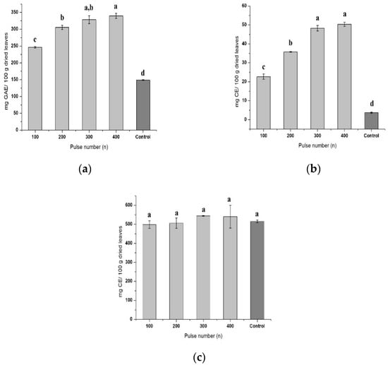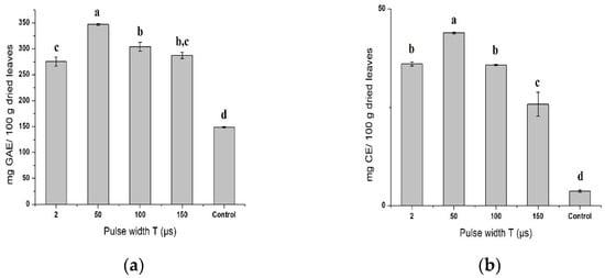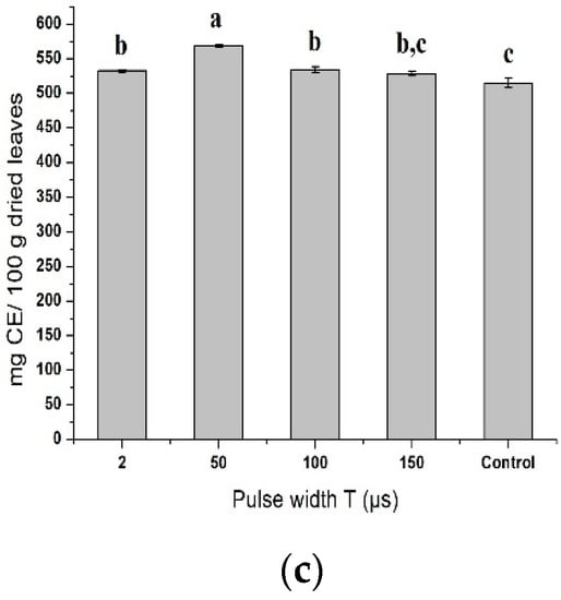 Variation of the phenolic compound extraction yield as a function of the pulse width. (a) Total phenolic content; (b) Total flavonoid content; (c) Condensed tannin content. Means not sharing any letters are significantly different.
