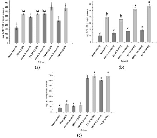 Variation of the phenolic compound extraction yield as a function of the ethanol concentration. (a) Total phenolic content; (b) Total flavonoid content; (c) Condensed tannin content. Means not sharing any letters are significantly different.