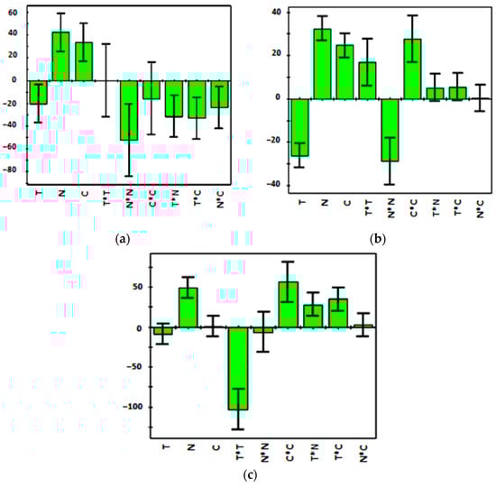Coefficients of mathematical models plotted by MODDE. (a) Total phenols; (b) Total flavonoids; (c) Condensed tannins.