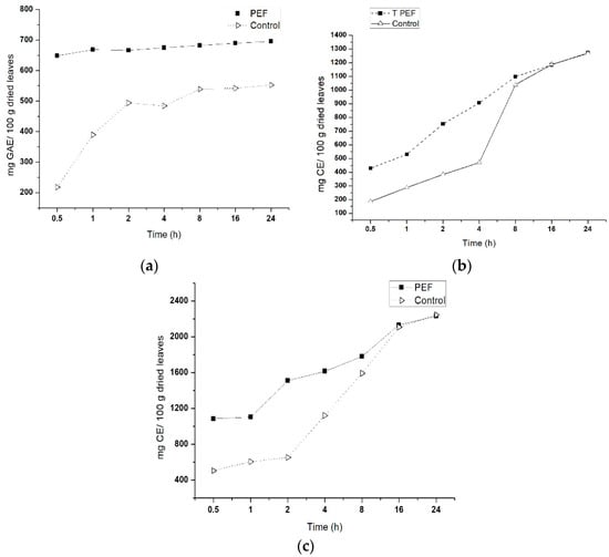 Unlike the previous experiments in which extraction was performed immediately after exposure to PEF, this section concerns the analysis of the extraction kinetics of each compound during the 24-h maceration period. The results plotted in Figure 6 were obtained with the optimal values obtained previously (T = 39 µs, n = 356, and [C] = 60%). The effect of PEF treatment on the phenol compound was significant, and the effect was more pronounced on total phenols.