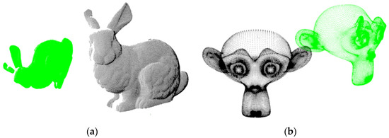 In order to test the effectiveness of the proposed algorithm, the data sets Bunny (40256) and Monkey (125952) from Stanford University were adopted for simulation. The initial state of the point cloud is shown in Figure 4. The model computer used in the test is I5-10400F, configured with a memory of 16G, a display card of Nvidia GTX 1060 6G, an operating system of win10 64 bit, and is operated on VS2019. The target point cloud was rotated −50 degrees on the Z axis, and shifted 5 mm in X and Y directions, respectively, but −10 mm in the Z direction, which was then used as a point cloud to be registered. The downsampling grid size was set to 0.05 mm. Since the initial alignment results obtained by the method in the literature [21] have a large deviation, the alignment accuracy and speed were further compared in this paper. and the proposed algorithm was compared to standard ICP, RANSAC algorithms, Depth Filtering-ICP. The initial state of the point cloud is shown in Figure 4.