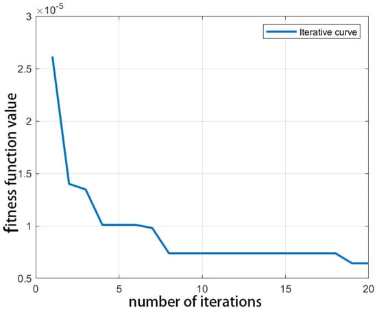 We regarded the percentage occupying the total number of the points of the point cloud in each interval as the corresponding interval value and characteristic value. The default values were adopted for other parameters, which were 16 before optimization. Moreover, it was 0.500000 for the fitness function value. It was 0.000015 for the evaluation function value. After optimization, they were 42, 0.239051, and 0.000006, respectively, for the default value, the fitness function value, and the evaluation function value. For convergence curve of the optimized RANSAC algorithm of IWOA, it is shown in Figure 5.