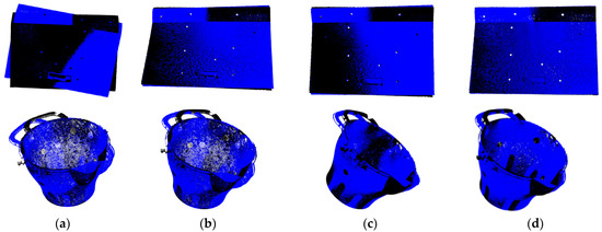 Results of workpiece point cloud registration. (a) Standard ICP algorithm; (b) Standard RANSAC algorithm; (c) Depth Filtering-ICP; (d) IWOA-RANSAC-ICP algorithm.