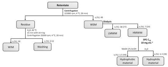 Schematic representation of the fractionation steps of the retentate. Yields are expressed on a dry weight basis (the values between brackets correspond to yields calculated based on the weight basis of water-soluble material, WSM, or on high molecular weight material, HMWM). AcOH—acetic acid. LMWM—low molecular weight material. MeOH—methanol. WIM—water insoluble material.