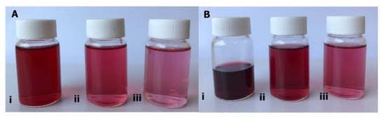 The use of isolated anthocyanins (Figure 2B) resulted in a tonic water with lower L*, a* and b* values (Table 5), corresponding to a more purple bluish red tone, when compared to the colour of the beverage when the WSM fraction was added (Figure 2A). As the hydrophobic material obtained from solid-phase extraction was only 6.16% of the WSM, for the same final concentration in the beverage, the isolated anthocyanins were 16 times more concentrated, explaining the higher colour intensity, reflected in an increment in the absorbance values at 520 nm of almost three times. The colour variation is only due to the sample concentration since the pH of the tonic water was 3 and did not change with extract addition. However, the colour of elderberry anthocyanins is pH-dependent for neutral and basic pH (Supplementary Material Figure S1 and Table S1). The pink colour is maintained from pH 3 until pH 6. The anthocyanins shift from a flavylium cation at pH 3–6 to a neutral quinoidal base at pH 7, which causes the colour to shift from red to purple. At pH 7, an equilibrium between the blue and the pink (a* and b* values) was observed (Table S1). This is in accordance with the maximum absorbance at 520 nm of the sample at pH 3 and the maximum absorbance at 580 nm at pH 8 (Figure S1).