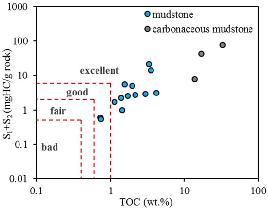 TOC is an important indicator and, when combined with S1 + S2, can evaluate the abundance of organic matter in source rocks. The TOC of the coal sample is 43.9 wt.%; the TOC distribution of the carbonaceous mudstone samples is 13.9~33.1 wt.%, with an average of 21.4 wt.%, and the S1 + S2 value is 7.77~76.38 mgHC/g rock, with an average of 42.66 mgHC/g rock. The TOC distribution of dark mudstone samples is 0.53~4.2 wt.%, with an average of 1.71 wt.%, and the S1 + S2 value is 0.53~21.51 mgHC/g rock, with an average of 4.90 mgHC/g rock. Generally speaking, the rock display is predominantly good to excellent (Figure 3).