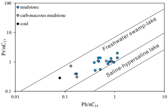 Furthermore, many researchers used the crossplot of Pr/nC17 and Ph/nC18 to represent oil maturity, as well as the source rock depositional environment [33,34,35,36]. Compared with coal, the ratio of isoprenoid to normal alkane in dark mudstone is relatively high. The Pr/nC17 and Ph/nC18 values of coal are 0.28 and 0.08, respectively, the average Pr/nC17 and Ph/nC18 values of carbonaceous mudstone are 0.69 and 0.33, respectively, and the average Pr/nC17 and Ph/nC18 values of dark mudstone are 1.01 and 0.64, respectively (Table 1). From this plot (Figure 6), it is evident that the source rock samples were deposited in a freshwater swamp lacustrine facies environment.