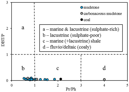 Cross plot of DBT/P ratios vs. Pr/Ph (after Hughes et al., 1995 [42]).
