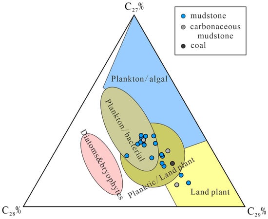 C29 regular sterane accounted for a relatively large proportion of the samples selected in this study. The C29% value of the coal sample is 56.1%. The C29% value of carbonaceous mudstone samples is 37.0%~63.6%, with an average of 50.4%. C29% in dark mudstone samples ranges from 33.5% to 68.3%, with an average of 44.3%. The depositional environment of samples is mainly a terrestrial and shallow water environment, as shown in Figure 7.
