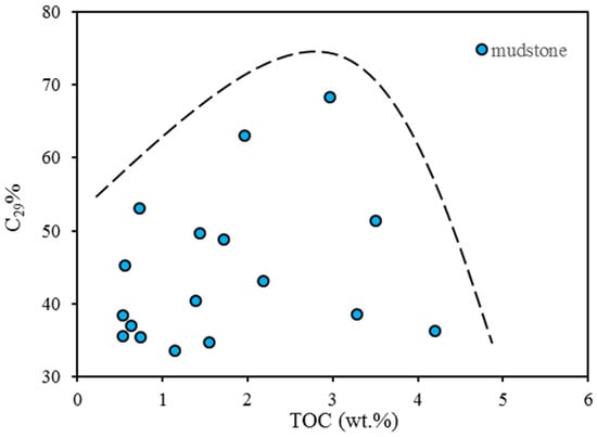 Relationship between C29 sterane content and TOC for dark mudstone.