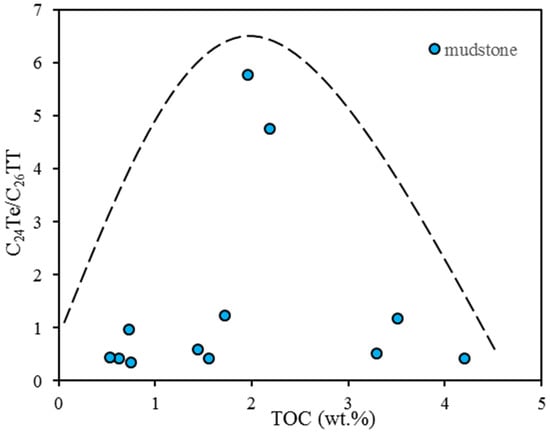 Relationship between C24Te/C26TT and TOC for dark mudstone.