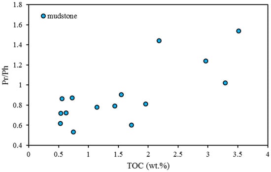 The shallow water environment is turbulent, with high oxygen content and strong oxidation (Figure 12), which seems to be detrimental to the preservation and enrichment of organic matter. However, after drawing the cross plot of Pr/Ph to TOC, we found that the TOC of most dark mudstone increases with the increase in Pr/Ph value (Figure 17), indicating that the partial oxidation environment is more advantageous to the enrichment of organic matter in coal-measure source rocks. This demonstrates that the factors that influence the development of deep–semideep lacustrine facies source rocks and coal-measure source rocks are distinct.