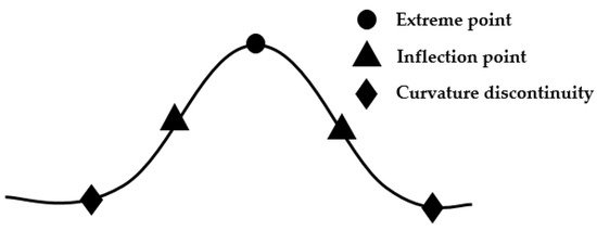 In B-spline curve fitting, zero inner knots represent a straight line. As the shape complexity increases, so does the inner knot number. The knot guidance technology proposed in this paper mainly captures the feature points of the curve through the preprocessing of the curve data points. The feature points include jump points (position discontinuity points), sharp points (tangent discontinuity points), curvature discontinuity points, curvature extreme points and inflection points. This paper mainly focuses on the engineering application of ship line, which includes three types of feature points, as shown in the Figure 2.