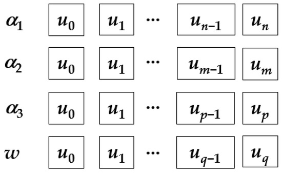 In the iterative calculation of population position, different individuals have different internal knot rates λ, which causes the dimensions to be different for each individual, as shown in Figure 4. The dimension corresponds to the number of internal knots. In order to find fewer control points to complete the curve fitting, we must ensure the diversity of individuals. When ωi moves towards or away from α, its dimension remains unchanged. We deal with α whose dimension is different from ωi. Then we can get , and all of them have the same dimensions with ωi.