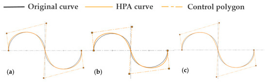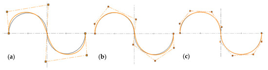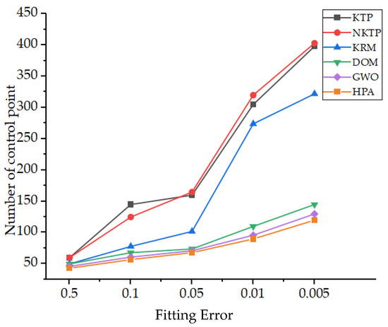 The least-squares fitting accuracies of Figure 9a–c are 0.0207, 0.0016, and 0.0004, respectively. It can be seen from the results that as E decreases, the final curve fitting result is getting better, and more control points are required.