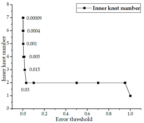 The BIC method considers the complexity of the calculation model and avoids the over fitting problem by adding the penalty term of model complexity. When the number of knots and control points is small, the BIC value will decrease with increasing the number of knots until it reaches the minimum value. Then, as the number of knots continues to increase, the accuracy of the curve improves slowly, and the BIC value will increase. In practical engineering application, Formulas (18) and (19) are more intuitive and convenient.