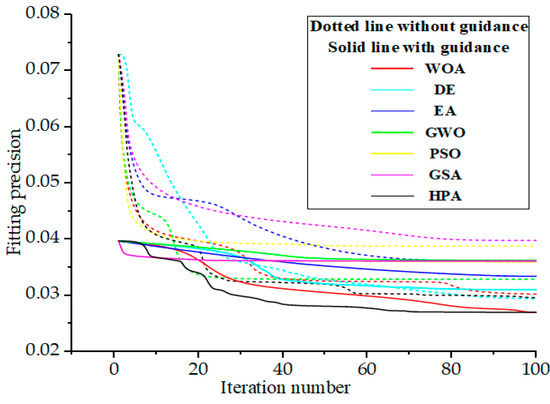 The population size determines the number of parallel solution paths. When the iteration number Max_iter is 20 and the error threshold E is 0.1, the population size W is set to 10, 20 and 50, respectively; the fitting result is recorded as shown in Figure 7.