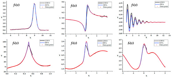 In the Gray Wolf Optimizer (GWO) for knot placement in B-spline curve fitting [19], the BIC calculation formula is shown in Formula (24). The HPA proposed in this paper is much better than GWO in fitting the function f4(x).