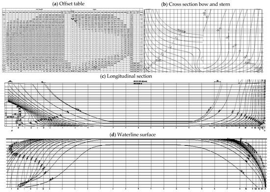(a) Offset table and ship line diagram, which include (b) cross section bow, (c) longitudinal section and (d) waterline surface.