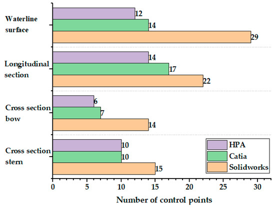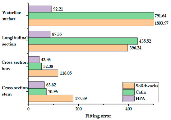 Solidworks and Catia are popular design softwares at present. In particular, Catia has more prominent capabilities in complex surface design and reverse engineering. They are widely used in shipbuilding, aviation and other industries. Take the complex ship line on the cross section, longitudinal section and waterline surface and fit it through the existing design software Solidworks, Catia and HPA. Figure 17 compares the maximum error of Solidworks, Catia and HPA fitting curves under the condition of the same number of control points.