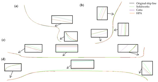 Fitting results of ship line of (a) cross section stern, (b) cross section bow, (c) longitudinal section and (d) waterline surface with Solidworks, Catia and HPA.