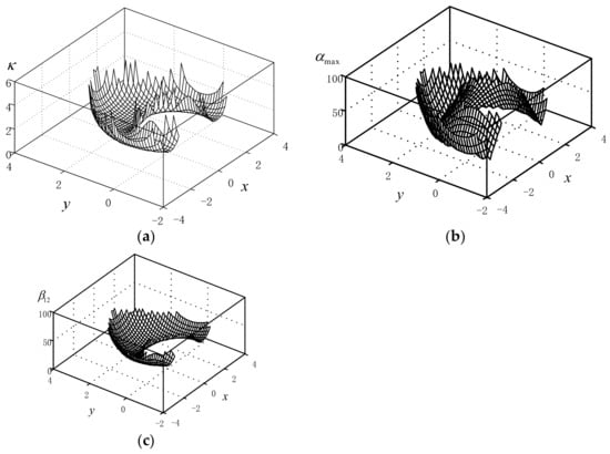 Contours of and of the maximum ITA and CTA in bounded workspace. (a) Contours of ; (b) contours of ITA—; (c) contours of CTA in workspace bounded by .
