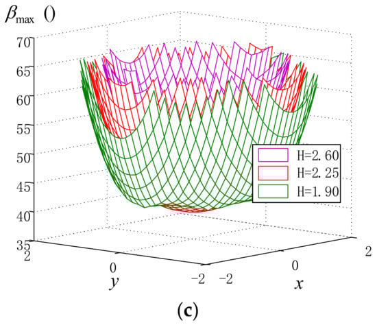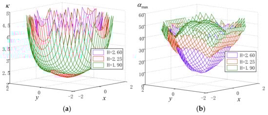 Since the workspace of the Delta robot is a space volume rather than a plane, it is better to investigate the distribution algorithm of , the maximum ITA () and the maximum CTA () with a given , by which the moving platform is restrained to have motion only on the horizontal plane. As shown in Figure 7, the variation in is extremely similar to that in , no matter what value may take, which is similar to the relationship analyzed in the Diamond robot. However, it can be seen from Figure 7b that the variation in changes violently with the decrease in . Furthermore, it can be concluded that a bad ITA may still be taken even if the condition number is fine throughout the workspace. In other words, the condition number cannot thoroughly depict the distance from the singularity of parallel robots. Therefore, it may not be very suitable for merely taking the condition number or its modified versions as a performance index of parallel robots for performance evaluation or optimal design. Then, it is necessary to introduce the ITA and CTA into the optimal design of parallel robots. Figure 8 and Figure 9 exactly justify the above analysis and prove that all of these characteristic parameters nearly play the same role in determining a better-conditioned workspace.