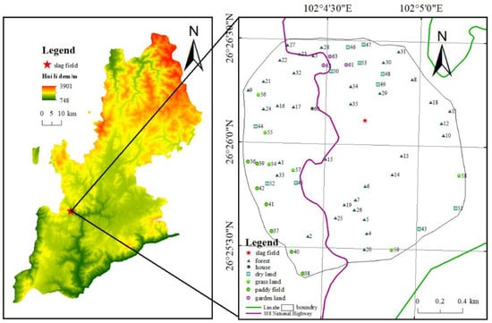 The study area is located in the southwest of Huili City (Figure 1), which is on the east side of National Highway 108 with convenient transportation. It belongs to a dry and hot valley area, with a subtropical humid monsoon climate, an annual average temperature of 15.1 °C, rainfall of 1130.9 mm, wind speed of 1.6 m/s, and the dominant northern direction wind. The area has a typical mountain valley landform, which belongs to the middle and low mountains eroded by flowing water. There are no other industrial and mining pollution sources within 1 km of the surrounding area. The slag field is located in the middle of the study area and is a valley-type tailing facility with a total storage capacity of approximately 2.62 million m3. At present, there are 34,000 m3 of acid leached nickel slag and 64,000 m3 of gypsum slag. There are agricultural land (paddy fields, dry land, grassland, garden land) and forest land between the main roads in the affected area of the slag field. Paddy field is mainly for rice cultivation, dry land is mainly for corn and sweet potato, and the garden land is mainly for pomegranate and walnut. Based on results from the drilling investigation, the foundation of the auxiliary dam area is mainly composed of the Quaternary Holocene slope deposits (Q4dl) and the lower section of the Upper Triassic Baiguowan (T3bg 1). The parent material is mainly composed of sandstone, metamorphic sandstone, and granite. The study area belongs to the middle and high mountain area with large terrain slope and optimal surface runoff conditions. Part of the atmospheric precipitation infiltrates the groundwater system, and part of the surface runoff flows into the Lima River, the lowest drainage base level in the area.