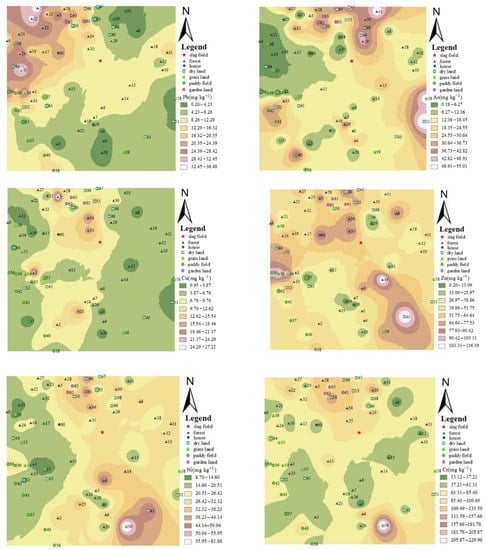 The vertical distribution pattern of heavy metals (Pb, As, Cu, Zn, Ni, Cr) in affected area of slag field was shown in Figure 2. The six heavy metals in the study area had an island-like (Pb), strip-like (Cu), and spot-like (As, Zn, Ni, Cr) distribution. Sites with the highest content of Pb was mainly distributed in the areas around the National Highway 108 (site #3, 22, 23, 24, 27, 28, 32, 38, 40, 44, 45, 50, 54, 55, 57, 60–63 points, Figure 2) and around the slag field (site #34, 35, Figure 2). Pb are mainly distributed in the upper reaches and southeastern parts of the Lima River. The high As content areas (site #29, 31, 47, 49, 51, 58 points, Figure 2) are distributed in dry land and forest land in the northeast of the study area and the whole south. It is possible that these areas are located at the bottom of the slope, with serious soil erosion and low vegetation coverage. Under the influence of the dry and hot valley, heavy metals are accumulated by rainwater. Sites with low content of the overall Cu content was 0.94–27.27 mg·kg−1, and the pollution level was relatively low. The areas with high content of Cu (site #1, 3, 25, 34, 35 points, Figure 2) were distributed in strip-like form near the National Highway 108. Except for the lower reaches of Lima River with serious Zn pollution (site #14, 43 points, Figure 2), the remaining study areas had uniform distribution of Zn. The sites with low content of Ni were in the west of the study area, and the sites with high content of Ni (site #6, 16, 34, 43, 59, 61 points, Figure 2) was in the east of the study area, especially in the lower reaches of the Lima River. The areas with high content of Cr (site #30, 59, 60 points, Figure 2) showed a spot-like distribution in the northern woodland, garden land, dry land, and the lower reaches of the Lima River. The contents of As, Cu, Zn, Ni, and Cr were relatively high not only in the surrounding areas of the slag field, but also in the garden and dry land, indicating that As, Cu, Zn, Ni, and Cr in the garden and dry land are affected by other factors in addition to the slag field. It is hypothesized that this could be due to the differences in land use types, fertilization, and agricultural production methods since there are no other industrial and mining pollution sources in the affected area []. Agricultural irrigation using surface water can affect the content of heavy metals in the topsoil of the region.