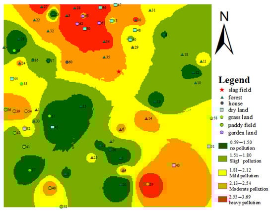 Nemerow comprehensive pollution index showed that sites with Slight Pollution and Mild Pollution accounted for 26.98% and 3.17% of all the sampling sites, and nearly 70% of the sites in the study area have no heavy metal pollution in the soil. Spatial interpolation and comprehensive evaluation showed that No Pollution and Slight Pollution are mainly distributed in forest and vegetation coverage areas, while Moderate and Heavy Pollution are mainly distributed in crop planting areas and areas near slag fields.