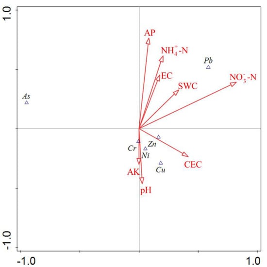 Pearson correlation analysis can reveal the relationship between the two pollutants. In order to further explore the influence of various physical and chemical factors on heavy metals, CCA analysis was carried out on soil physical and chemical properties (Figure 5). -N, -N, AP, EC, and SWC were the main factors that affect the content of Pb. As was positively correlated with AP, but was not correlated with -N. As was negatively correlated with -N, AK, EC, CEC, SWC, and pH. The contents of Cu and Ni had no significant correlation with -N, AK, CEC, pH, and SWC, but had negative correlation with -N, AP, and EC. The content of Zn in the topsoil was mainly affected by and had positive correlation with -N, AK, CEC, SWC, and pH. The content of Zn was negatively correlated with -N, AP, and EC. The content of Cr was positively correlated with AK, CEC, and pH, and was negatively correlated with -N, -N, AP, EC, and SWC.