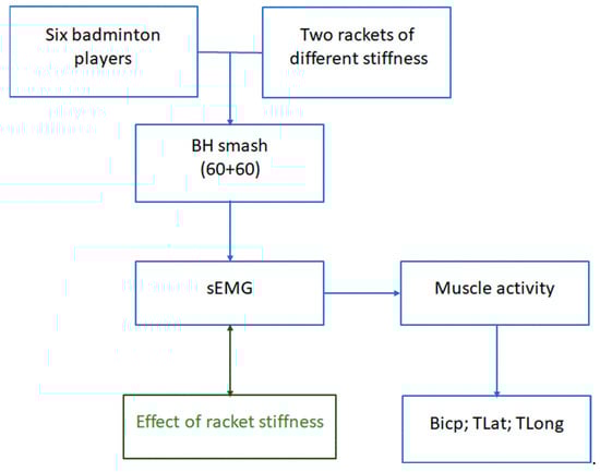 Figure 1 shows a flow diagram of the experimental procedure. The 6 athletes each performed 10 backhand smashes per racket, and used two rackets of different stiffness, resulting in a total of 120 smashes. Surface electromyography was used to analyze the muscular activity during each backhand (BH) smash. Normally, this movement is used when the player is not in position to play a forehand shot, and it is used to earn time by forcing the other player to the back of the court. The two rackets used by all volunteers were Yonex Duora 33 and Yonex Duora 88. The frame and string were the same for both rackets, namely Yonex BG3, with a diameter of 0.74 mm and 125 N tension.