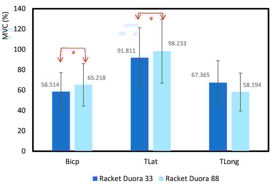 Figure 6 shows the average values of the normalized intermuscular amplitude (%MVC) and their standard deviation, comparing both rackets.