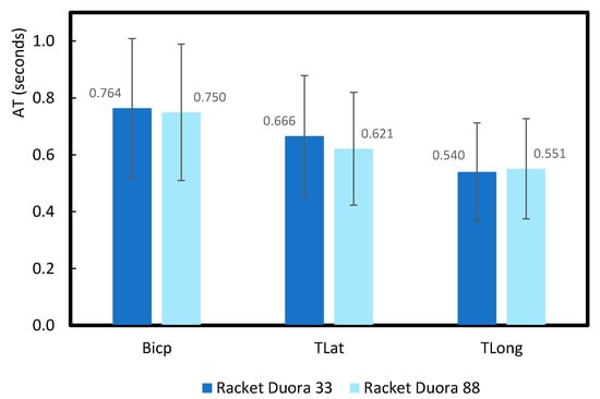 Table 2 shows that the AT for the TLong and Bicp is the same for both rackets, which indicates that the activation time does not depend on the racket in use, and rather it is a difference in recruitment coming from the movement performed.
