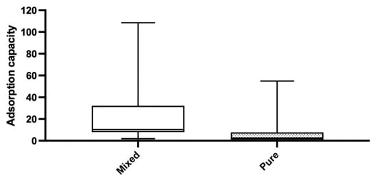 Due to the binary nature of the data for pure versus mixed solution (competing ions) and washed versus unwashed biochar treatment, a Mann–Whitney test was used to determine significance in adsorption capacity. This test was chosen due to the less strict assumptions about the data distribution when compared with a standard t-test but would still provide information about whether the two groups were statistically different or the same [59]. The results for the purity of solution had a p value < 0.0001 and washing had a value of 0.0335. These results indicate that washing the biochar after pyrolysis (thus removing ash from the surface) and using a pure solution versus a mixed solution (competition with other ions) can be significant to the adsorption capacity of the biochar.