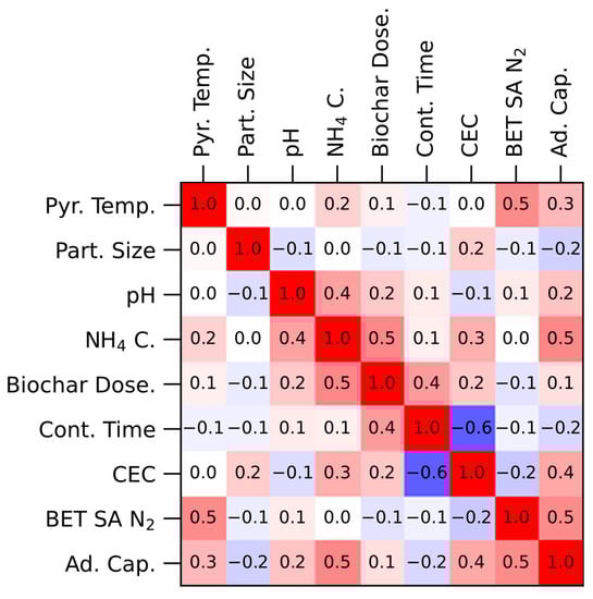 The correlation matrix shown in Figure 3 suggested a positive correlation between adsorption capacity and BET surface area, CEC, and ammonium concentration, and to a lesser extent pyrolysis temperature and solution pH. The magnitude of the correlation coefficients suggests there was a small negative correlation between adsorption capacity and particle size, and adsorption capacity and residence time. The correlation between adsorption capacity and biochar dosage was small and considered negligible for this analysis. From the magnitude of the coefficients, the strongest conclusions to be drawn from this analysis are the positive relationships between adsorption capacity and BET surface area, CEC and NH4+ concentration. These relationships make sense theoretically as well. As the BET surface area increases, there should be more adsorption sites available for ammonium to adhere to. Likewise, with an increase in ammonium concentration in solution, the number of collisions between ammonium ions and the biochar surface would increase, leading to an increase in adsorption. CEC indicates the ability of a material to bind positively charged ions, so an increase in CEC should also correspond with an increase in ammonium adsorption. However, in the case of CEC, the strength of this conclusion should perhaps be tempered—of the 210 reported measurements, only 57 reported CEC.