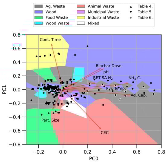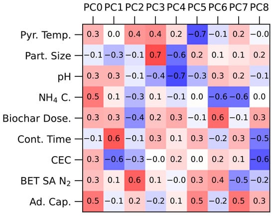 The PCA loading matrix in Figure 4 corroborated some of the relationships from the correlation matrix, though some of the principal components showed conflicting data. In addition, 80% of the total variance could be explained using the first five principal components (PC0-4), so subsequent PCs were not analyzed further. The relationships suggested by PC0 were positive between adsorption capacity and BET surface area, biochar dosage (g/mL biochar), ammonium concentration (NH4+ mg/L), pH solution and pyrolysis temperature. Looking at PC1, a similar relationship between adsorption capacity and BET surface area and pyrolysis temperature was noted, but the opposite relationship between adsorption and biochar dosage, ammonium concentration and pH was determined. Additionally, cation exchange capacity (CEC cmol/kg) showed a positive correlation according to PC1. PC3 confirms the positive relationship between adsorption and solution pH from PC0, but suggests an inverse relationship with pyrolysis temperature, particle size, biochar dosage, residence time, and BET surface area. As PC2 and PC4 have small coefficients for adsorption capacity, the relationships shown are likely less important than the other PCs.