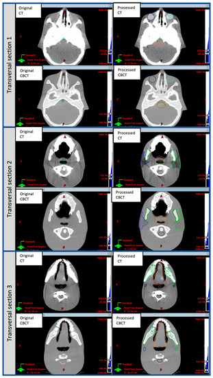 Original and post-processed CT and CBCT transverse sections of the CIRS ATOM Max Dental and Diagnostic Head Phantom Model-711 used in the method presented for DIR accuracy evaluation. Sections were chosen to visualize organs of interest. The HU values of parotid glands, larynx, oral cavity, brainstem and eyes were digitally modified using MATLAB and CERR tools, as described in Section 2.1.