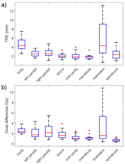 The dose error values for each OAR are plotted in Figure 3b. Similar to the TRE analysis, the median dose error value varied according to the OAR of interest. The mean ± SD dose difference values over all fractions and patients were 2.0 ± 4.3 Gy, 2.2 ± 2.4 Gy, 2.5 ± 2.7 Gy, 1.8 ± 1.8 Gy, 1.3 ± 1.6 Gy, 1.2 ± 1.8 Gy, 3.2 ± 2.6 Gy, 0.7 ± 0.7 Gy for the body, left parotid gland, right parotid gland, larynx, mandibula, brainstem and spinal cord, respectively.