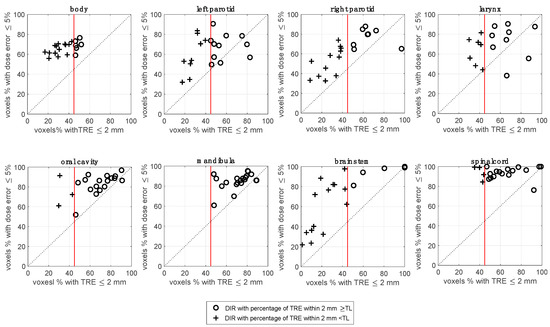 Correlation graph of the percentage of the TRE within 2 mm and percentage of voxels within 5% of dose error (3.5 Gy), across the 20 registrations and for each OAR. The ‘+’ markers indicate the cases for which the percentage of voxels was less than the 45% OTL, indicated as vertical red line. The OTL value was derived using TG132 datasets, as described in Section 3.4.