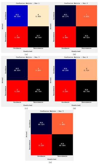 Figure 3 illustrates the set of confusion matrices formed by the DWOML-RWD model in different runs. With run-1, the DWOML-RWD model classified 412 samples into goodware and 417 samples into ransomware. At the same time, with run-2, the DWOML-RWD model classified 413 samples into goodware and 416 samples into ransomware. Simultaneously, with run-3, the DWOML-RWD model classified 415 samples into goodware and 418 samples into ransomware. Additionally, with run-4, the DWOML–-RWD model classified 414 samples into goodware and 418 samples into ransomware. Lastly, with run-5, the DWOML-RWD model classified 416 samples into goodware and 419 samples into ransomware.