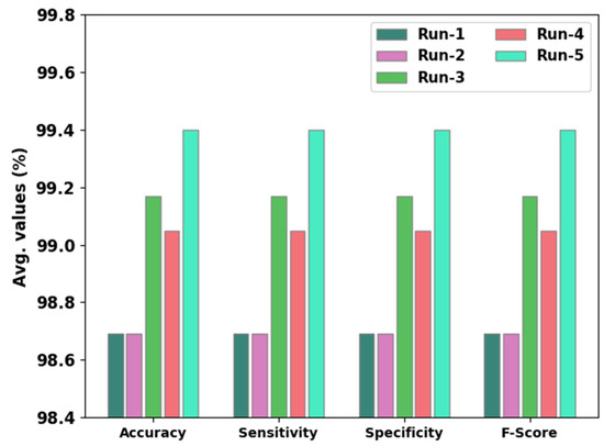 Table 2 displays the overall classification results of the DWOML-RWD model on ransomware detection. Figure 4 reports a brief ransomware classification performance of the DWOML-RWD model in terms of , , , and . The results imply that the DWOML-RWD model ensured enhanced performance under both classes. For instance, on run-1, the DWOML-RWD model attained an average , , , and of 98.69%, 98.69%, 98.69%, and 98.69%, respectively. Meanwhile, on run-2, the DWOML-RWD model gained an average , , , and of 98.69%, 98.69%, 98.69%, and 98.69%, respectively. Furthermore, on run-3, the DWOML-RWD model achieved an average , , , and of 99.17%, 99.17%, 99.17%, and 99.17%, respectively. Further, on run-4, the DWOML-RWD model acquired an average , , , and of 99.05%, 99.05%, 99.05%, and 99.05%, respectively. Lastly, on run-5, the DWOML-RWD model obtained an average , , , and of 99.40%, 99.40%, 99.40%, and 99.40%, respectively.