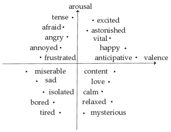 Figure 3 shows Russell’s two-dimensional expression of emotional space [53]. The abscissa is valence and the ordinate is arousal. Arousal indicates the intensity of emotions: a higher numerical value corresponds to a higher degree of emotional stimulation. The speech signals for high-aroused emotions, such as happiness and anger, include more quasi-periodic and low-frequency parts. The speech signals for Low-arousal emotions, such as sadness and tiredness, include more nonperiodic high-frequency parts and tail parts. The Mel spectrogram has a high resolution in the low-frequency part and is therefore suitable for high-arousal emotions. However, for some emotions with low arousal, more attention should be given to the high-frequency parts to achieve better SER. Therefore, in this paper, the IMel frequency domain is proposed and the IMel spectrogram, which is complementary to the Mel spectrogram and is generated by IMel filter banks, is obtained.