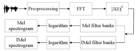 As shown in Figure 6, the speech signal is preprocessed, and then the energy obtained after a fast Fourier transform (FFT) is calculated. After passing through the Mel filter banks and the IMel filter banks separately, the logarithm is calculated, and finally the Mel spectrogram and the IMel spectrogram are obtained. The steps performed to generate the IMel spectrogram are as follows: