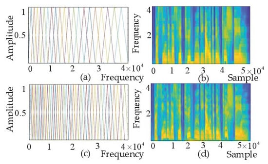 where is the frequency, expressed on a linear scale, and the unit is Hz; is the frequency on the Mel scale, and the unit is Mel. In Figure 2a, and are logarithms, and the resulting Mel filter banks are shown in Figure 2b. The resolution at the low frequency is higher than that at the high frequency, which is consistent with the characteristics of human hearing perception, and the Mel spectrogram based on the Mel filter banks has the same property. Therefore, the Mel spectrogram has been widely used and has achieved good results in the field of speech recognition. However, when applied to SER, it has certain limitations.