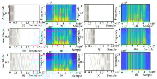 is expressed in the IMel frequency domain, which is opposite to the Mel frequency domain. Figure 4a shows the exponential relationship between and in the IMel frequency domain. As shown in Figure 4b, the high-frequency part of the IMel filter banks has a narrow bandwidth and high resolution, thus enhancing the influence of high-frequency signals. Therefore, the IMel spectrograms generated using the IMel filter banks have the same characteristics.