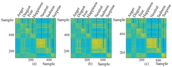 Table 2 shows that when = 8000 Hz, M = 60 and E = WA, the highest recognition rate of the EMO-DB database was 94.79 + 1.77%, that of the SAVEE database was 88.96 + 3.56%, and that of the RAVDESS database was 83.18 + 2.31%. This indicates that the frequency range of 0–8000 Hz reflects more comprehensive information. When the number M of filters was equal to 60, the decomposition of the spectrogram was more appropriate. Therefore, the following experiments for SI, GD and various types of emotion analysis were conducted with = 8000 Hz and M = 60.